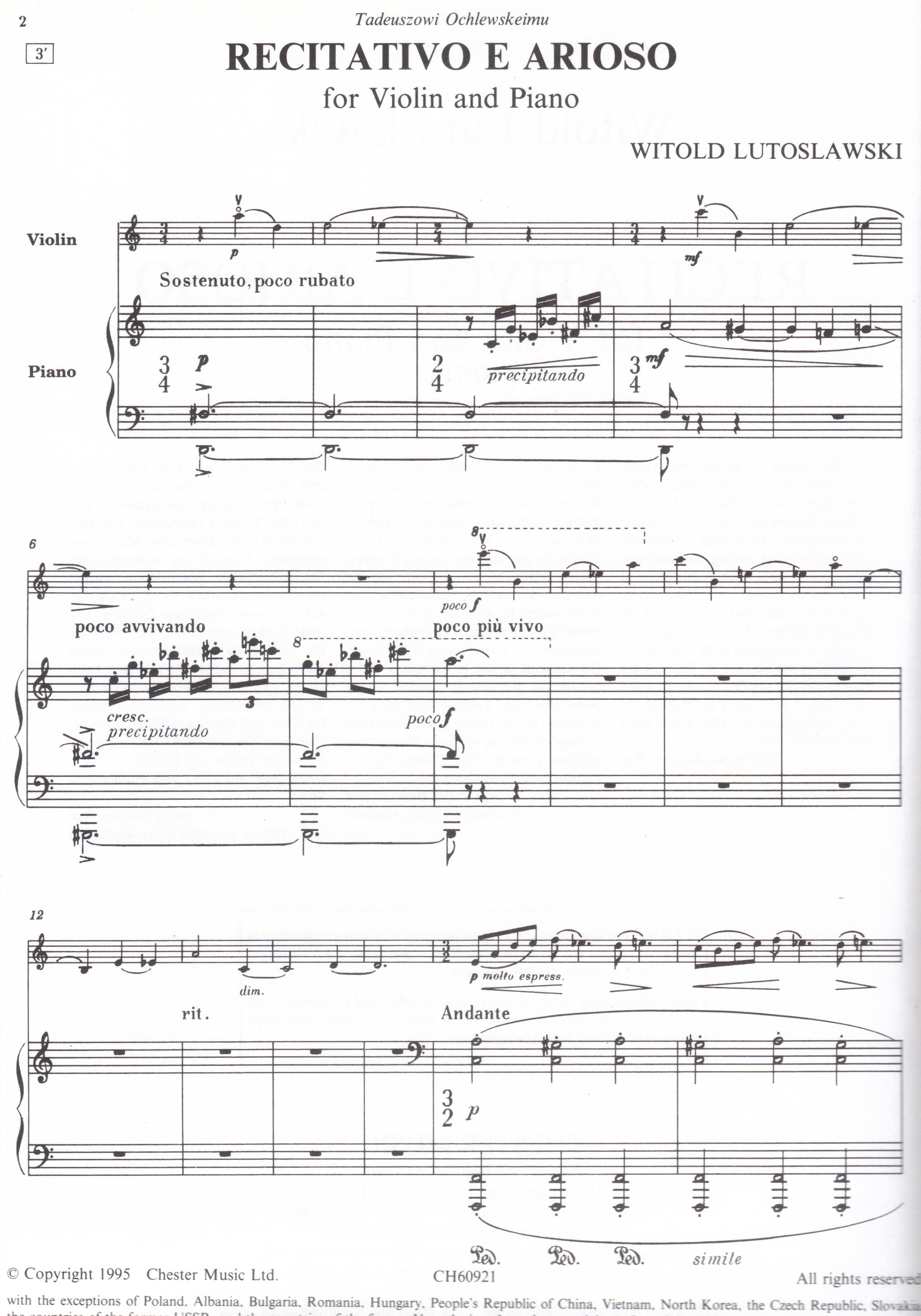 A pesar del reducido margen de maniobra que el régimen les imponía a los artistas de la época, consigue dar muestras de maestría y adelantarse a etapas posteriores, aunque no de una manera tan desarrollada, como podemos ver en el siguiente ejemplo para violín y piano. “Recitativo e Arioso” es una obra en la que todavía no vemos signos de innovaciones en la grafía, aunque difícilmente vemos trazos de las fuentes folclóricas de las que se supone debía beber.