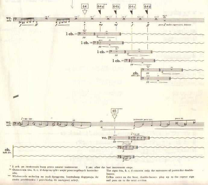 En lo referente a la escritura solista para el chelo volvemos a incidir en lo idiomático de su escritura. La obra comienza con una cadencia en la que vemos algunos elementos característicos del estilo de Lutosławski en la cuerda: la escritura sin compás, los contrastes entre fortes y pianos, especialmente en el uso de los armónicos, y a este respecto, la comodidad de la mano al ejecutarlos, diferenciando notablemente las notas graves naturales de las agudas con los armónicos.