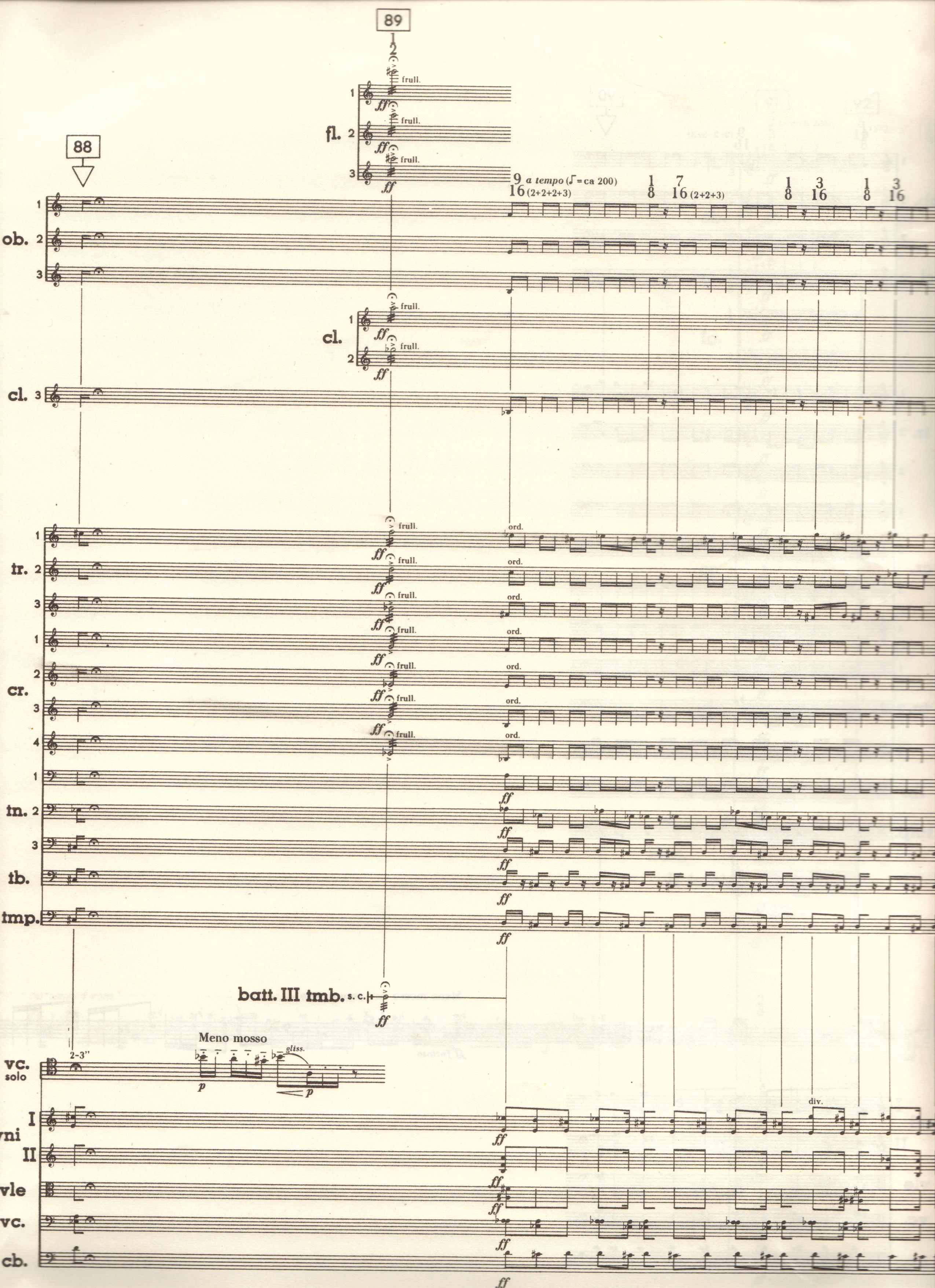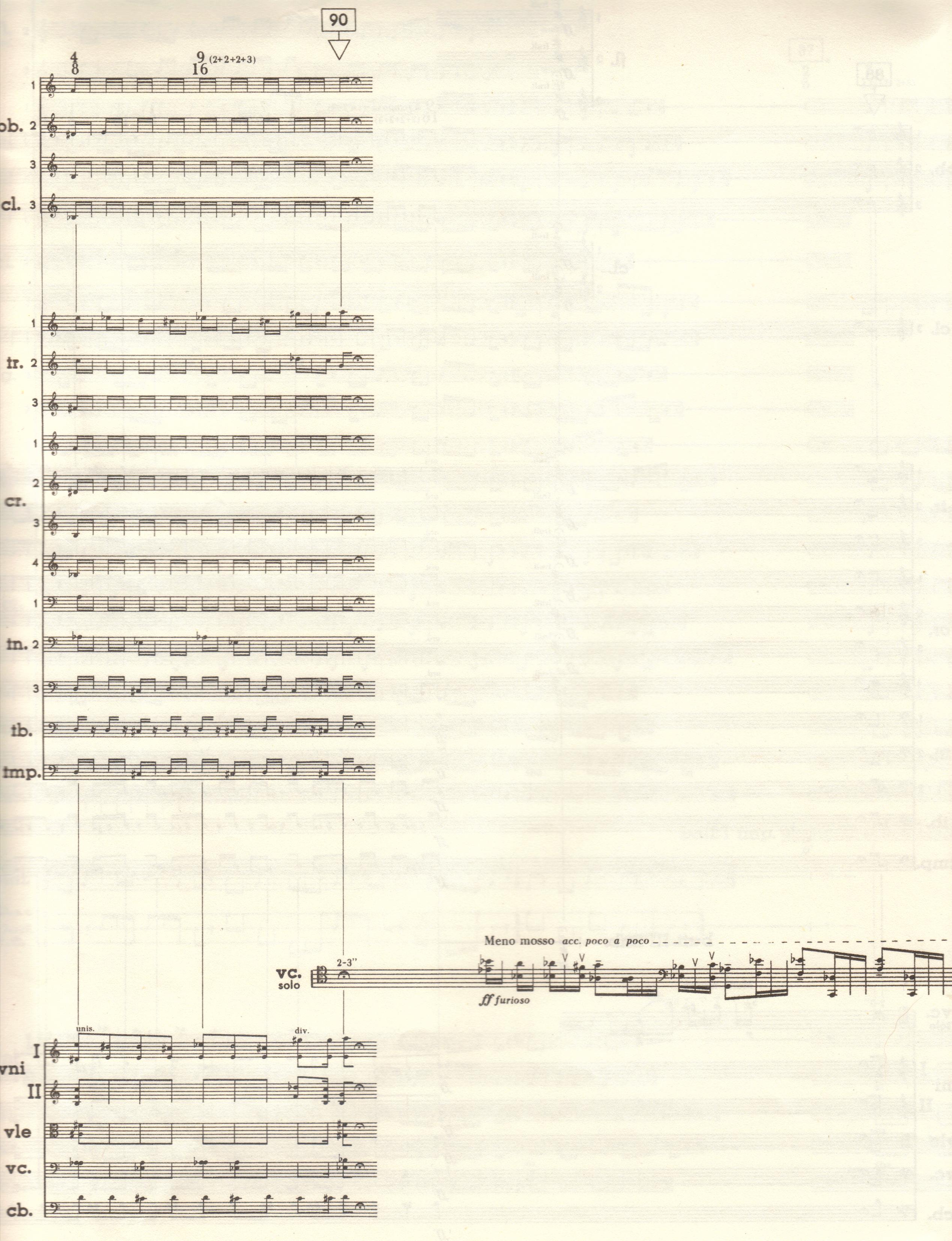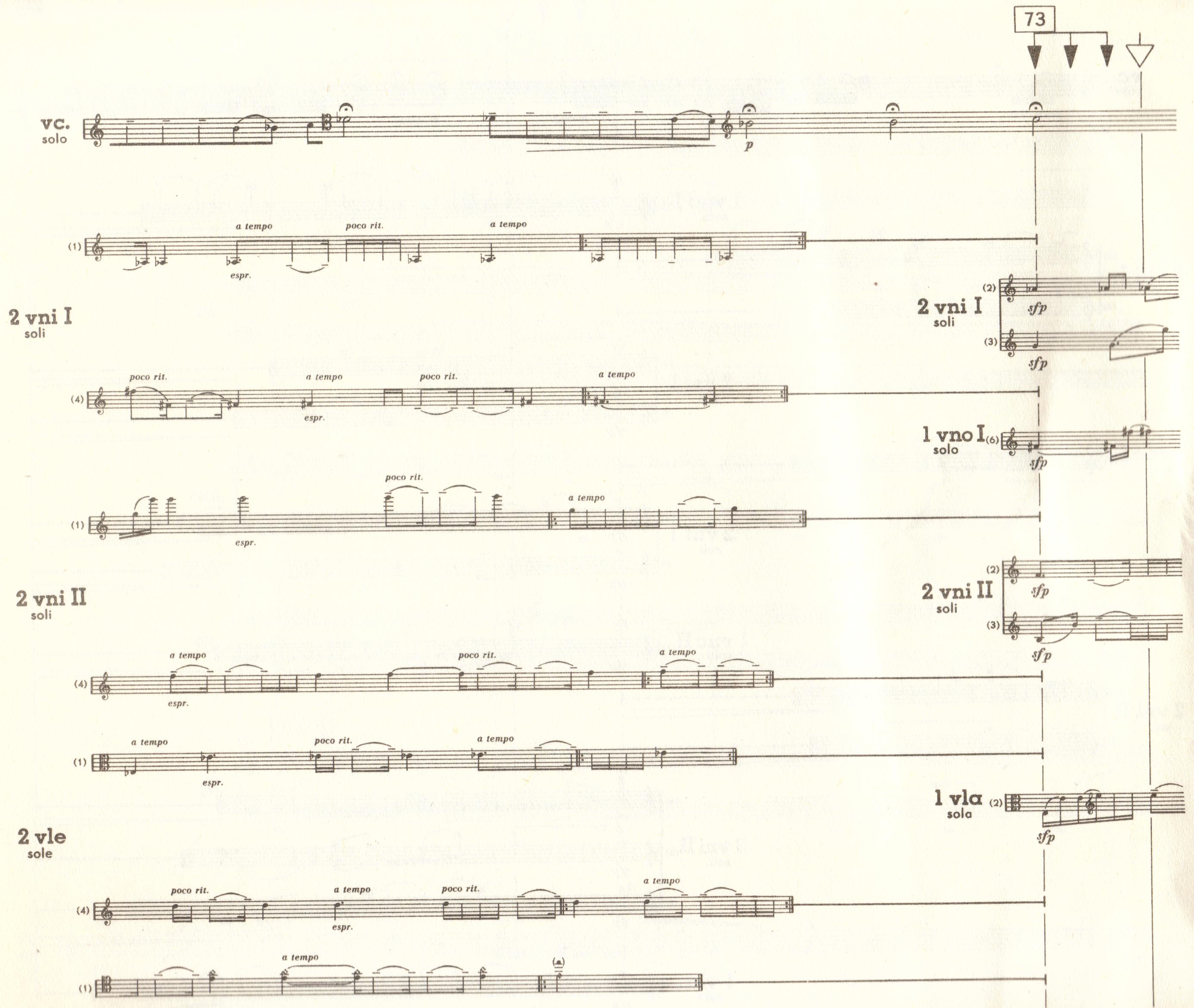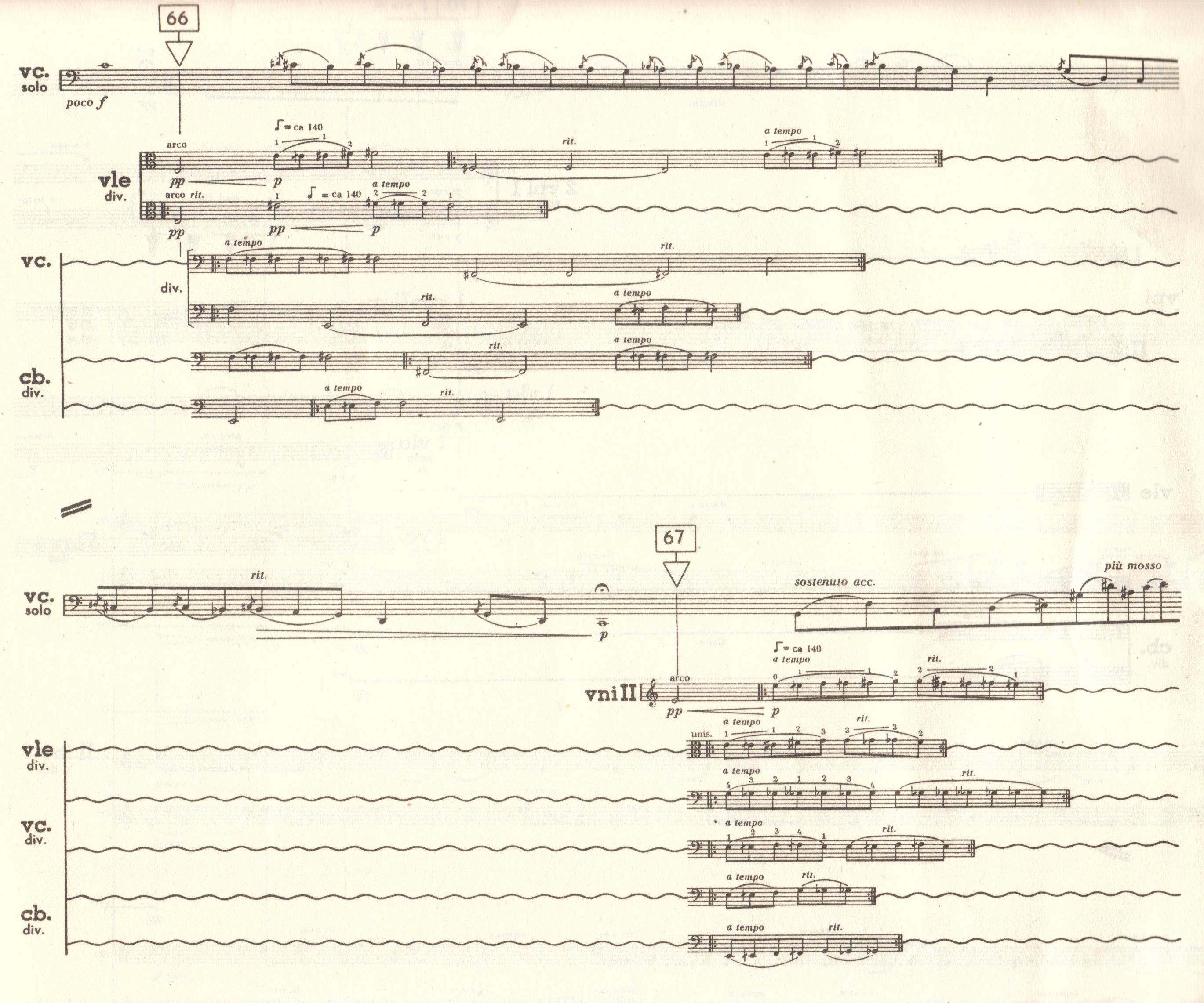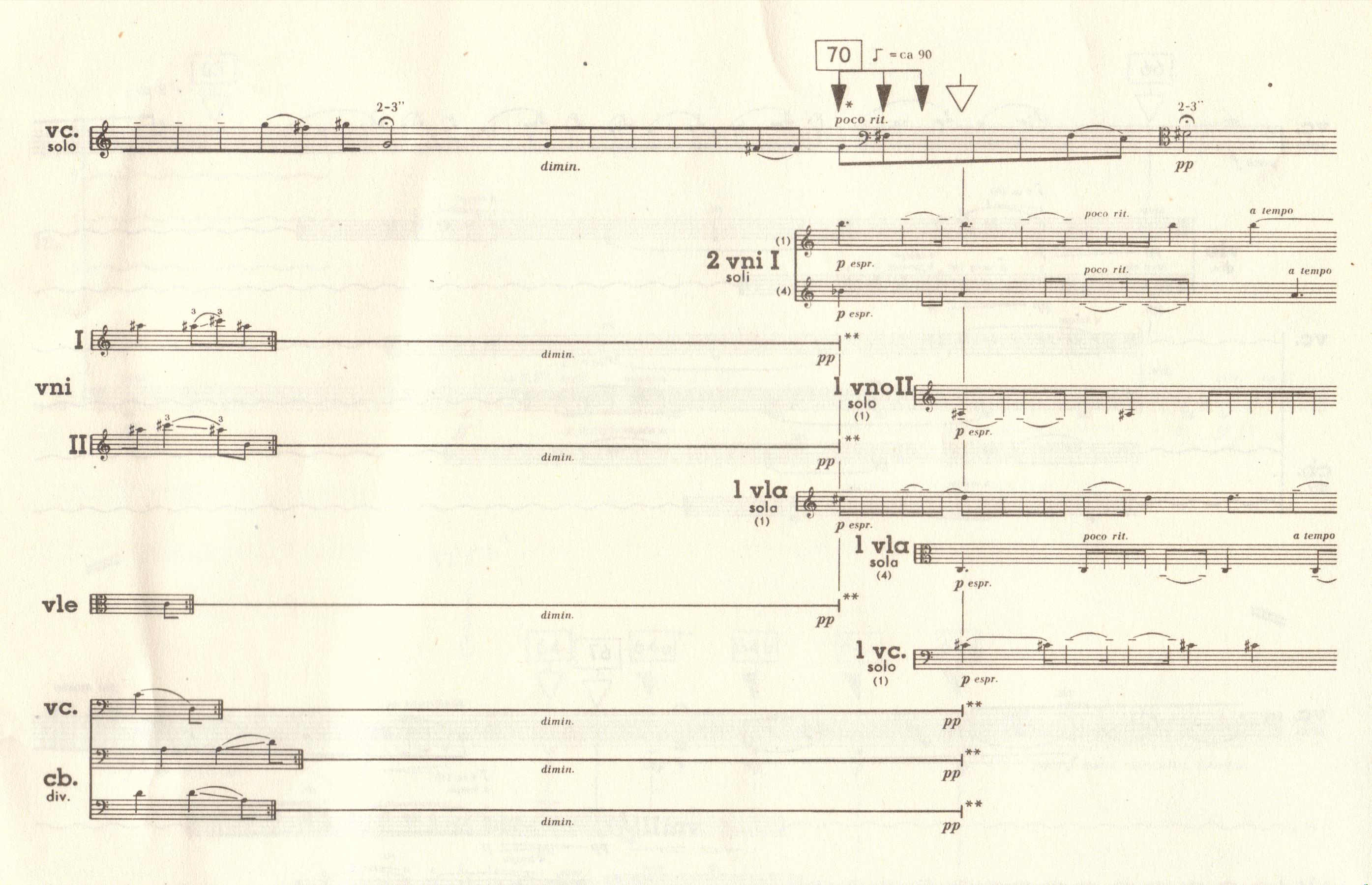La obra continúa con un pasaje muy inspirado en el que estos efectos ofrecen un resultado de gran expresividad. Empezamos con unas notas en pizzicato del chelo solista seguidas de breves silencios. Al agarrar el arco empieza a desgranar una melodía que va ganando en intensidad y en altura, creando una sensación de crescendo que viene arropado por un acompañamiento magistralmente elaborado en las cuerdas: mientras el chelo solista canta su línea melódica, como si fuera ajeno al resto de instrumentos, las flechas del director van marcando las entradas “ad libitum” y con barras de repetición indefinida de las cuerdas, desde los graves contrabajos en entradas paulatinas en divisi hasta los violines. Las entradas de cada grupo de las cuerdas producen una especie de efecto delay al marcar con las barras de repetición una línea melódica parecida entrando una detrás de otra, creando una especie de murmullo que va ganando en intensidad de una manera especialmente evocadora.