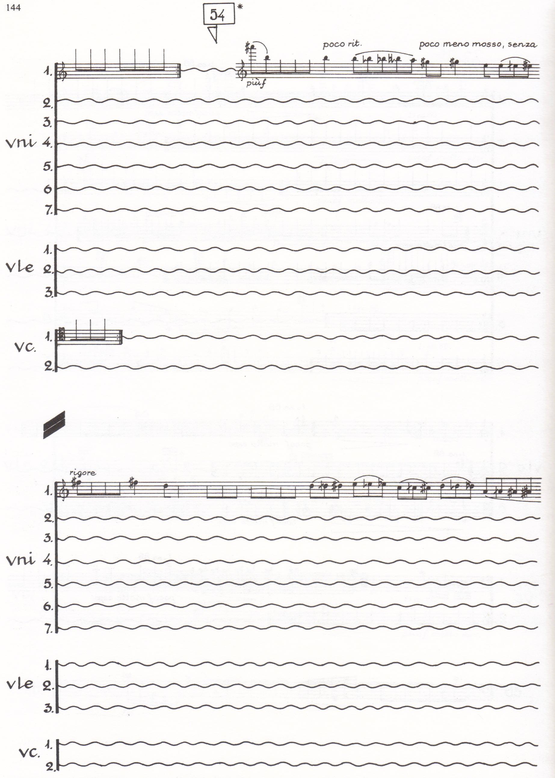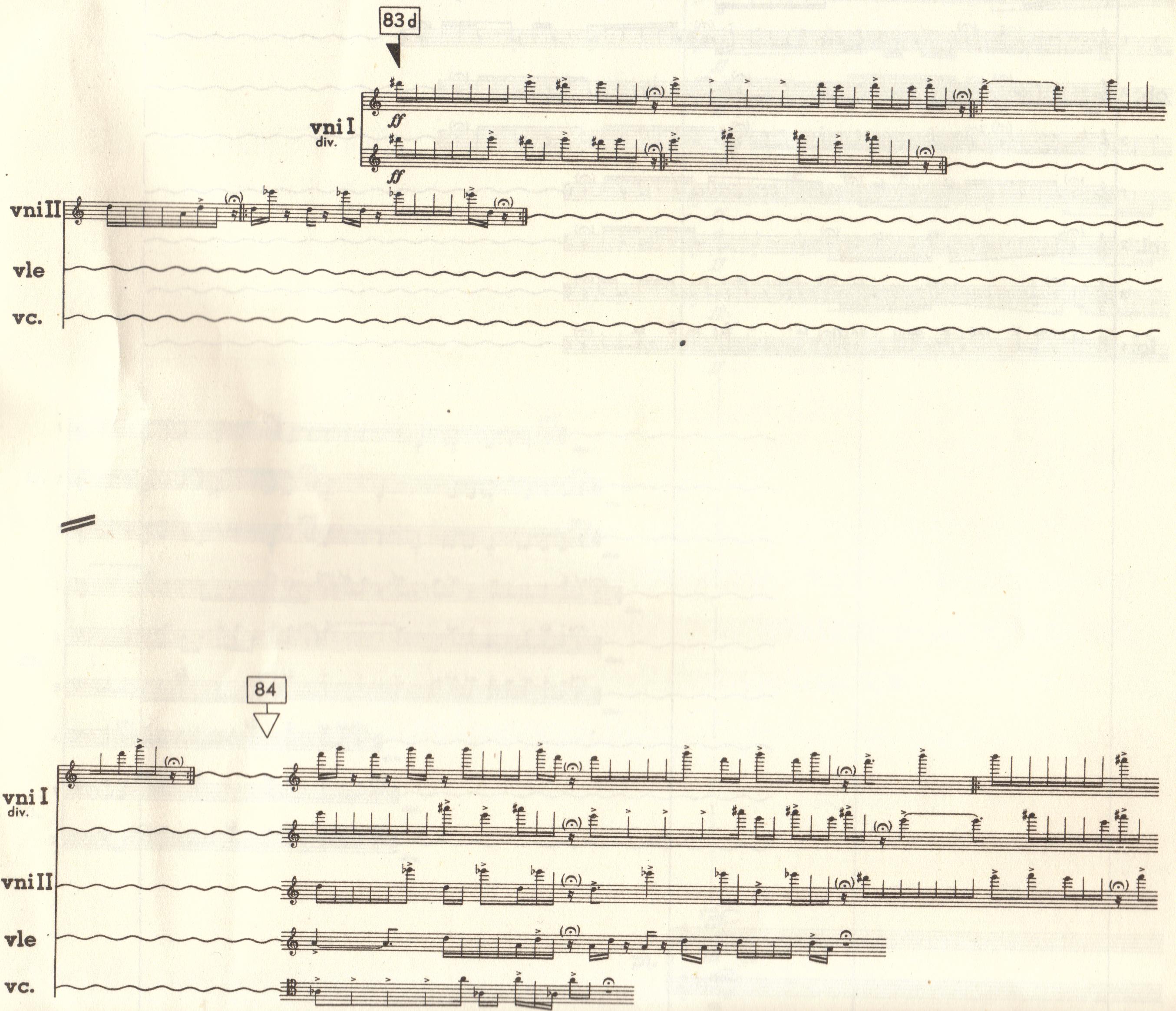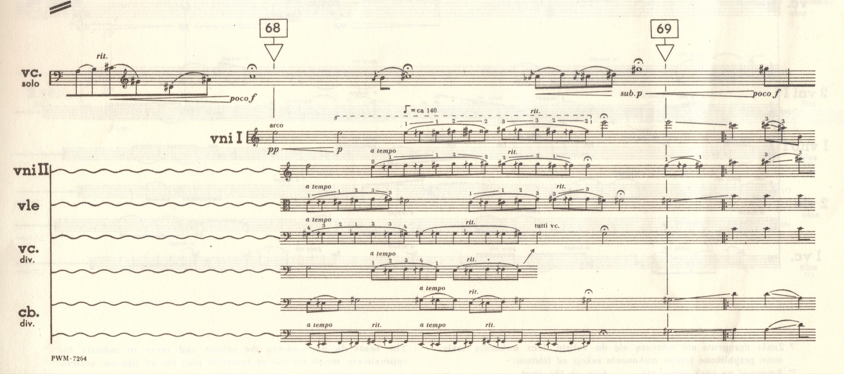 Hay un recurso que se repite en Lutosławski con cierta asiduidad y en el que se “adelanta” a un efecto usado posteriormente en música electrónica y en la técnica, por ejemplo, de la guitarra eléctrica, a través de pedales creados a tal efecto: el “delay”. En este fragmento vemos cómo se traslada de un violín a otro el comienzo del glizzando descendente, creando una atmósfera en la que parece que el sonido se diluye constantemente.