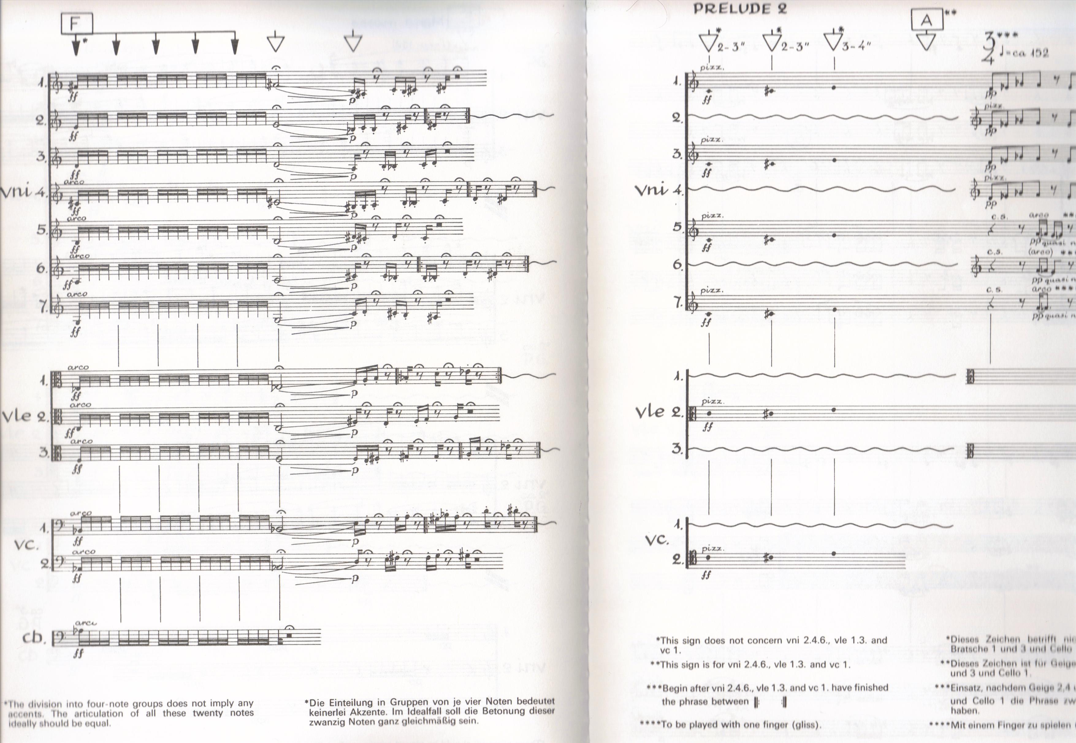 En 1972 compone “Preludios y Fuga” para 13 instrumentos de cuerda solistas. Esta obra de cámara resulta bastante novedosa y original al ofrecer, además de los recursos comentados hasta ahora, una estructura bipartita en la cual la primera parte consta de 7 preludios que ofrecen la posibilidad de ser interpretados en el orden que se desee, incluso prescindir de alguno. Lo que hace el compositor es establecer nexos entre las partes que son factibles para cada preludio, en la combinación que se desee, permitiendo solapar el final de uno con el principio de cualquier otro. Como vemos en este ejemplo, los violines 2, 3 y 4 mantienen un fragmento aleatorio de notas entrecortadas con arco, mientras los 1, 3 y 5 atacan la nueva parte, el 2º preludio, con pizzicato. Lo mismo ocurre con las violas y los chelos. Se destacan las nuevas entradas por la diferencia de dinámica, normalmente en ff. El resultado es una fusión entre las partes. Su conocimiento exhaustivo de los instrumentos de cuerda le permite efectos tan atractivos como el que aparece en el 3 por 4 mezclando sonidos con arco con otros en pizzicato de una manera muy original.