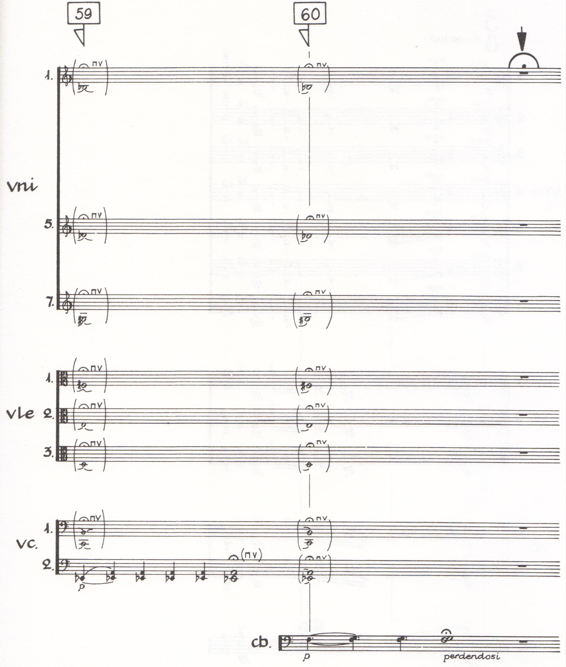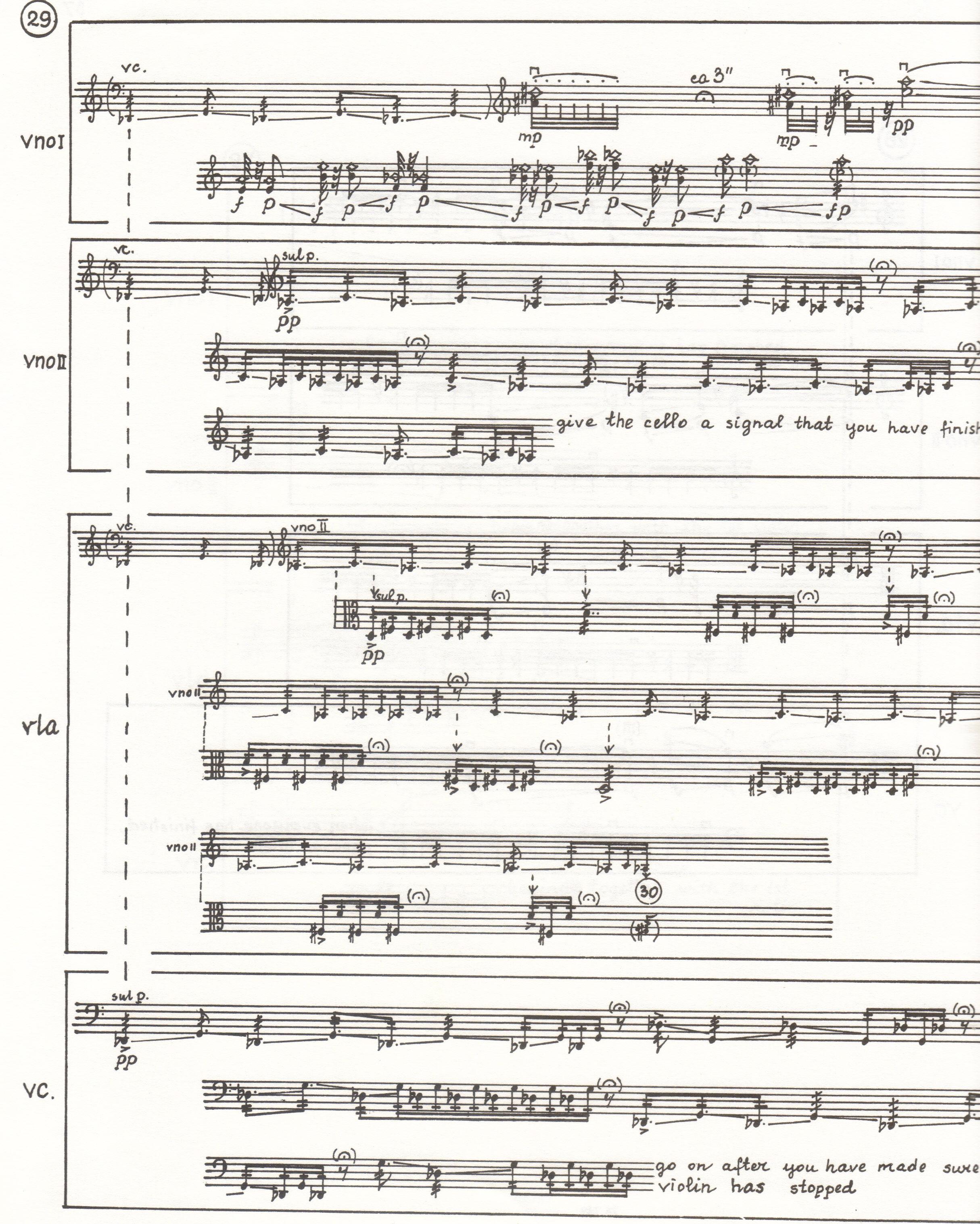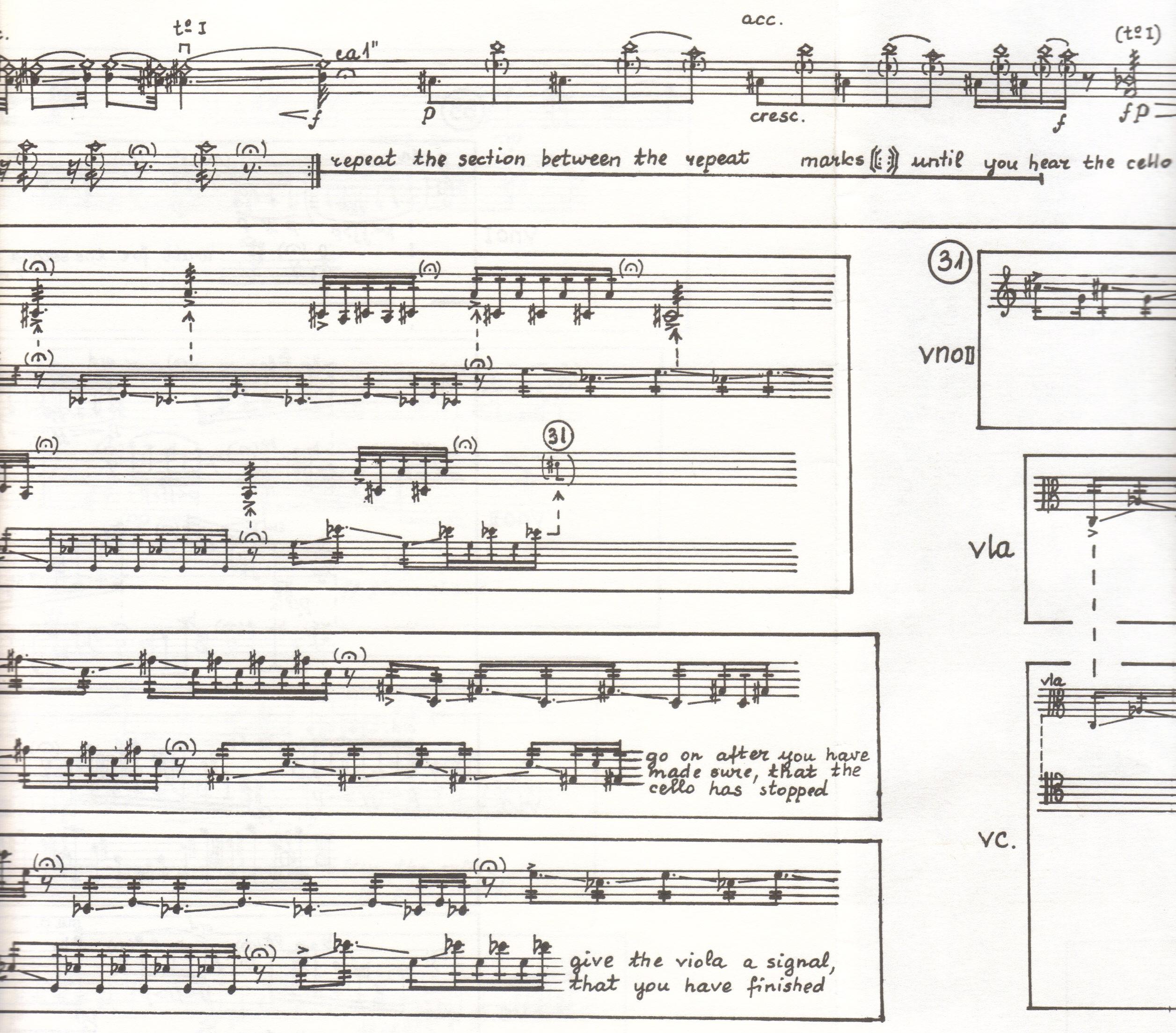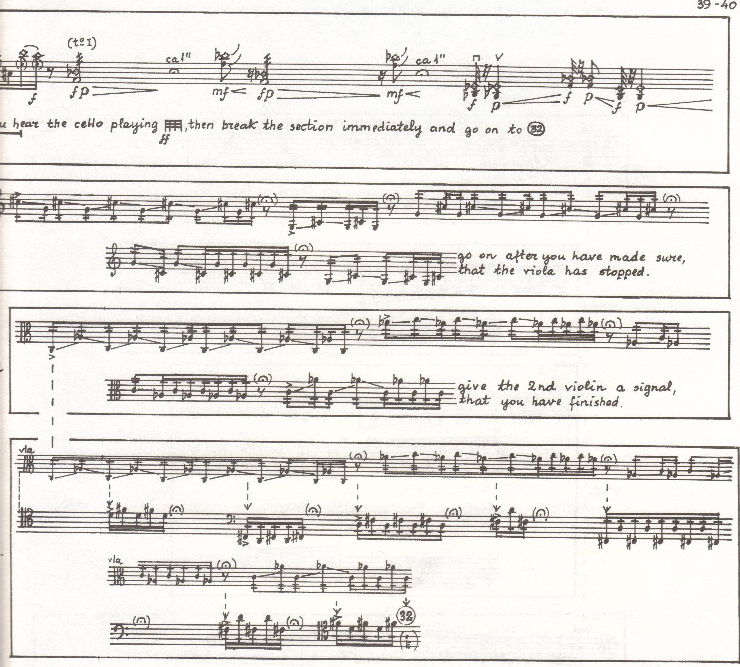 En la siguiente imagen, nº 5, tenemos más elementos característicos: la presentación de cada voz enmarcada en un cuadrado y por tanto su ejecución independiente, en este caso en pizzicato; los fragmentos entre barras de repetición que aleatoriamente cada intérprete repite hasta un momento señalado; la señalización de ese momento mediante indicaciones escritas del compositor que facilitan el paso organizado de una sección a otra: en las obras orquestales con director, se trataría de una flecha descendente; en este caso, se les pide a los violines y chelo que repitan indefinidamente su fragmento hasta que la viola ejecute, tras un silencio de 10 segundos, una característica pareja de dos notas en ff ya usada anteriormente en la obra. Tras esta interrupción o señal por parte de la viola, los demás instrumentos finalizan su fragmento enmarcado entre barras de repetición. Esto es así al aparecer tras esta barra de repetición una línea ondulada. De ser recta, la línea exigiría la interrupción brusca del fragmento, independientemente de que no esté terminado. En este caso, la viola sigue las indicaciones del compositor y tras dejar que los demás instrumentos completen su parte, espera el segundo indicado antes de pasar al siguiente pasaje. El resultado al oído es que las secciones se funden.