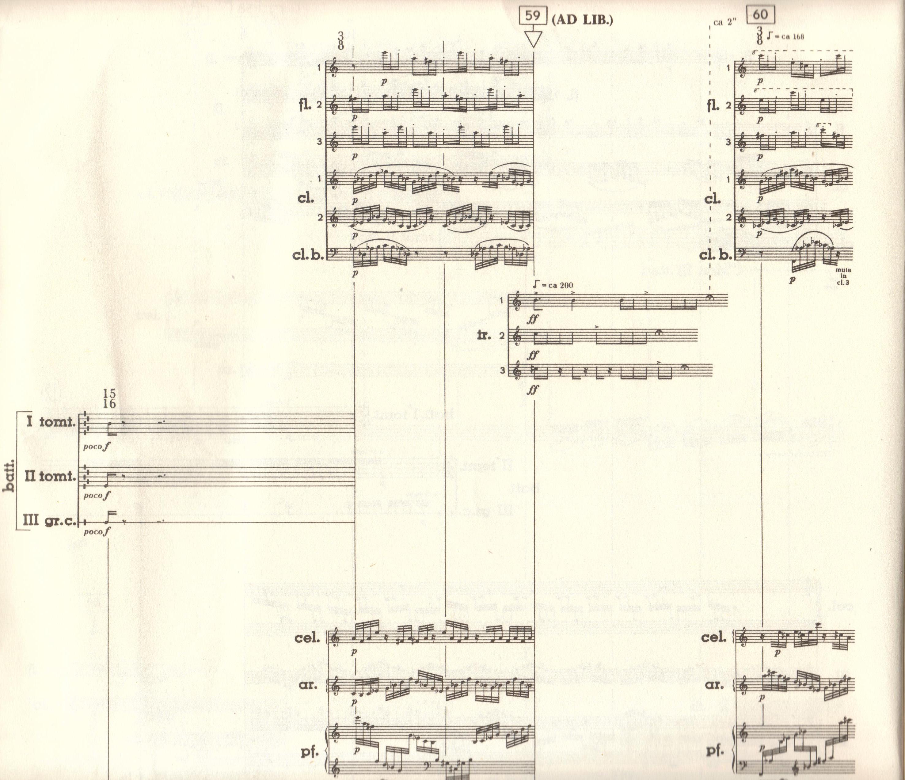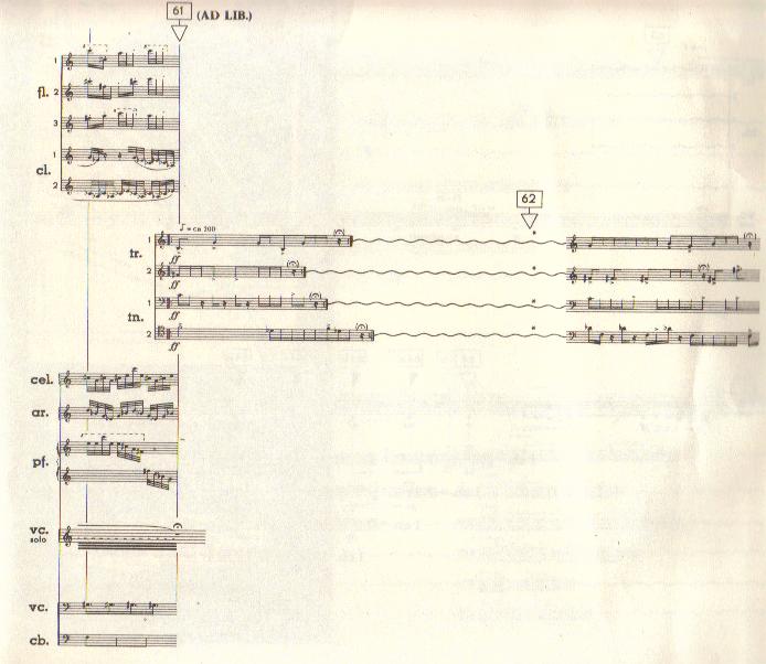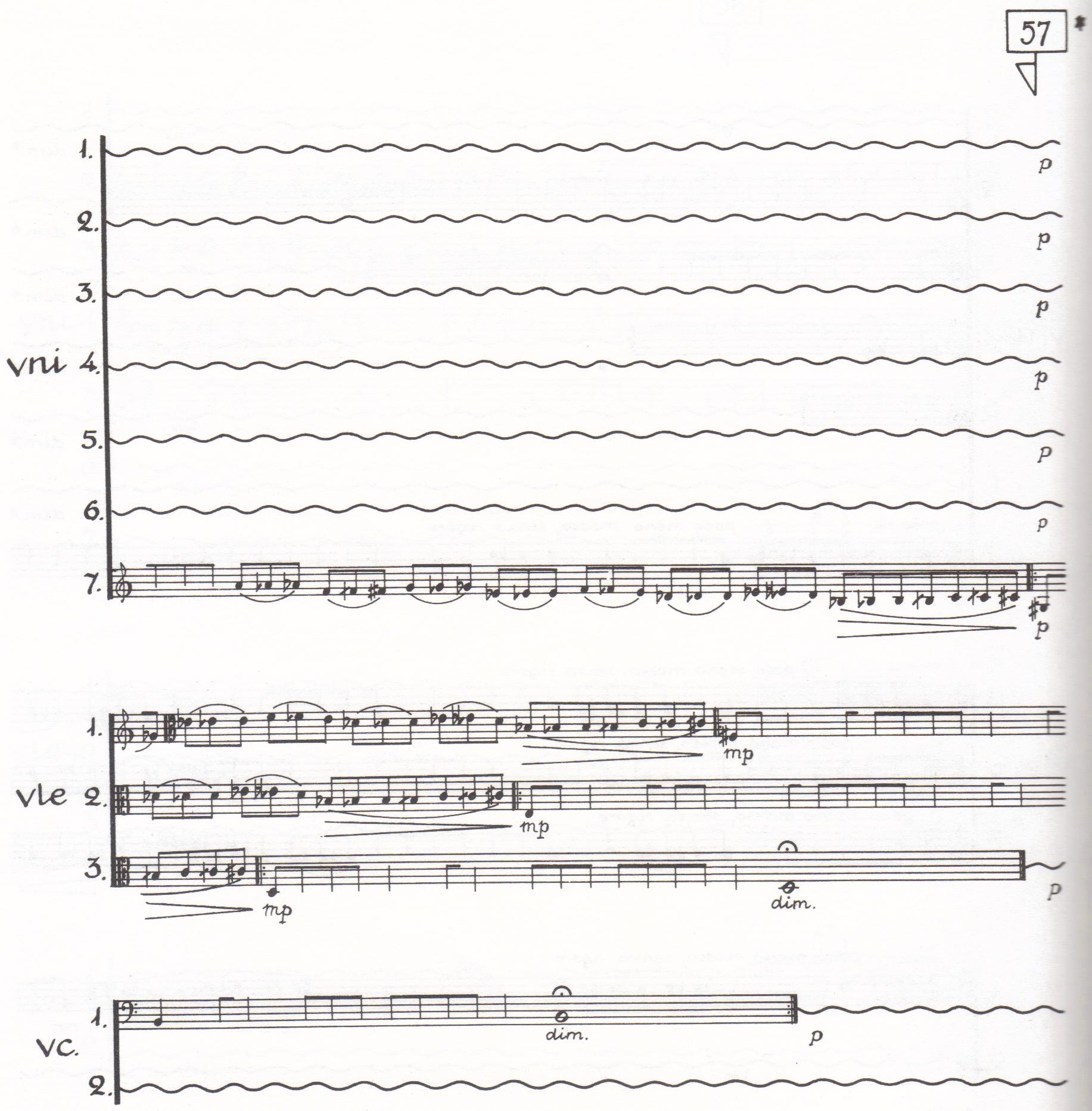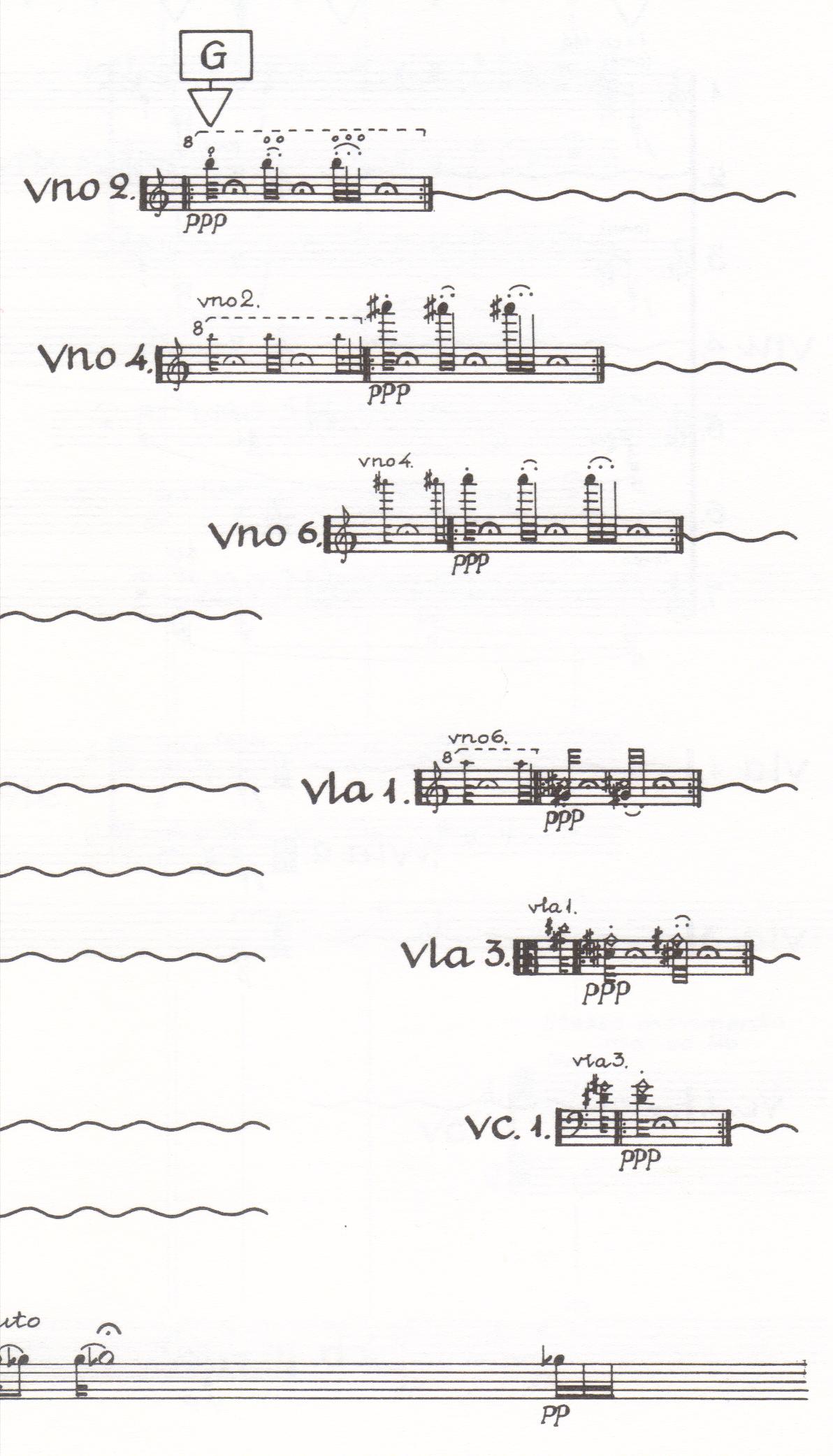 En la siguiente imagen, nº 5, tenemos más elementos característicos: la presentación de cada voz enmarcada en un cuadrado y por tanto su ejecución independiente, en este caso en pizzicato; los fragmentos entre barras de repetición que aleatoriamente cada intérprete repite hasta un momento señalado; la señalización de ese momento mediante indicaciones escritas del compositor que facilitan el paso organizado de una sección a otra: en las obras orquestales con director, se trataría de una flecha descendente; en este caso, se les pide a los violines y chelo que repitan indefinidamente su fragmento hasta que la viola ejecute, tras un silencio de 10 segundos, una característica pareja de dos notas en ff ya usada anteriormente en la obra. Tras esta interrupción o señal por parte de la viola, los demás instrumentos finalizan su fragmento enmarcado entre barras de repetición. Esto es así al aparecer tras esta barra de repetición una línea ondulada. De ser recta, la línea exigiría la interrupción brusca del fragmento, independientemente de que no esté terminado. En este caso, la viola sigue las indicaciones del compositor y tras dejar que los demás instrumentos completen su parte, espera el segundo indicado antes de pasar al siguiente pasaje. El resultado al oído es que las secciones se funden.