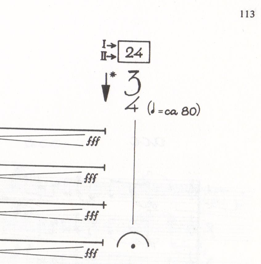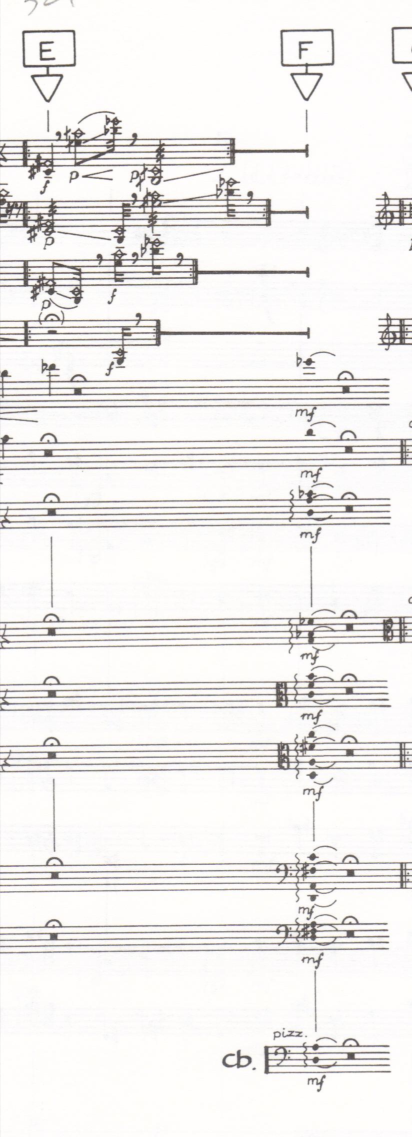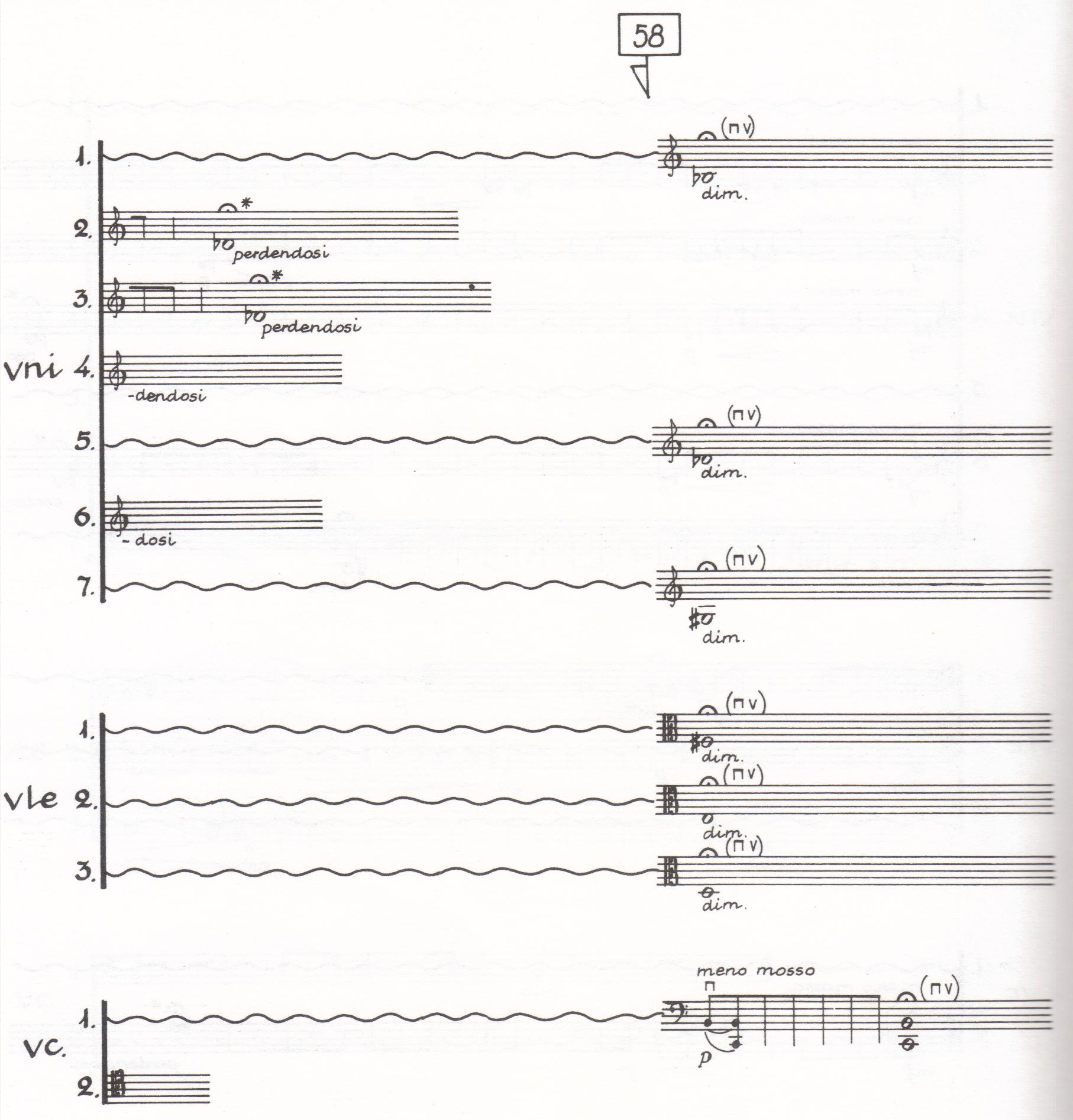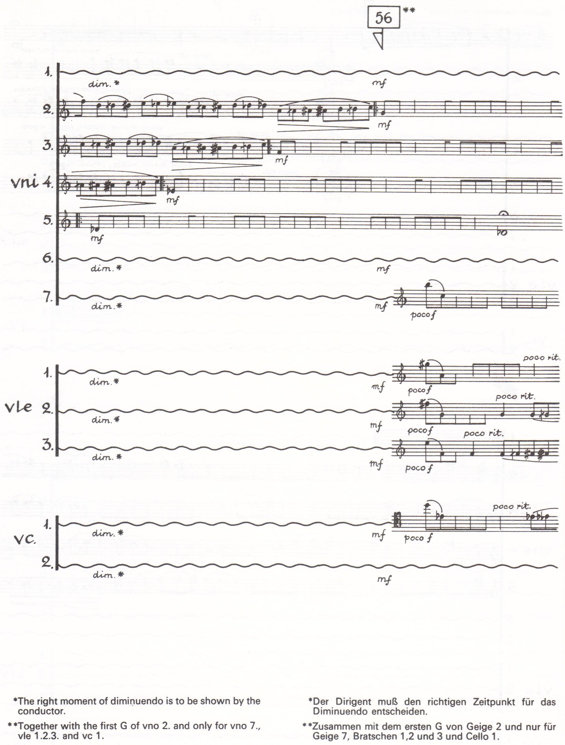 En la siguiente imagen, nº 5, tenemos más elementos característicos: la presentación de cada voz enmarcada en un cuadrado y por tanto su ejecución independiente, en este caso en pizzicato; los fragmentos entre barras de repetición que aleatoriamente cada intérprete repite hasta un momento señalado; la señalización de ese momento mediante indicaciones escritas del compositor que facilitan el paso organizado de una sección a otra: en las obras orquestales con director, se trataría de una flecha descendente; en este caso, se les pide a los violines y chelo que repitan indefinidamente su fragmento hasta que la viola ejecute, tras un silencio de 10 segundos, una característica pareja de dos notas en ff ya usada anteriormente en la obra. Tras esta interrupción o señal por parte de la viola, los demás instrumentos finalizan su fragmento enmarcado entre barras de repetición. Esto es así al aparecer tras esta barra de repetición una línea ondulada. De ser recta, la línea exigiría la interrupción brusca del fragmento, independientemente de que no esté terminado. En este caso, la viola sigue las indicaciones del compositor y tras dejar que los demás instrumentos completen su parte, espera el segundo indicado antes de pasar al siguiente pasaje. El resultado al oído es que las secciones se funden.
