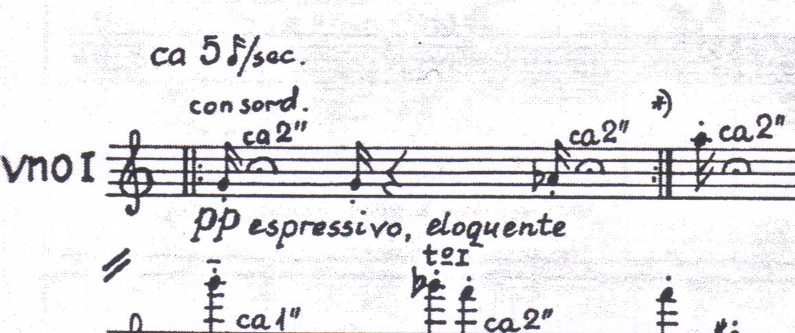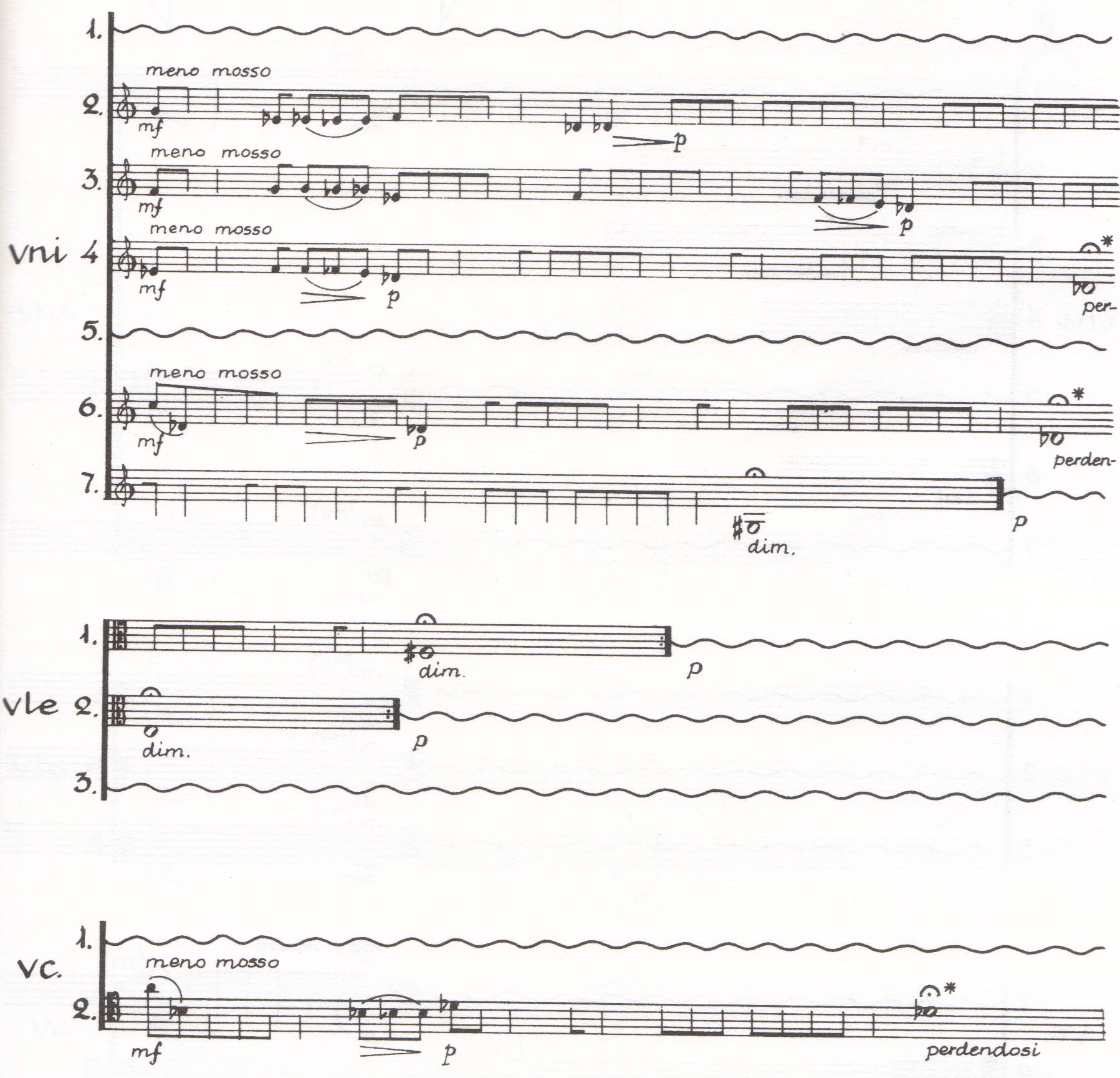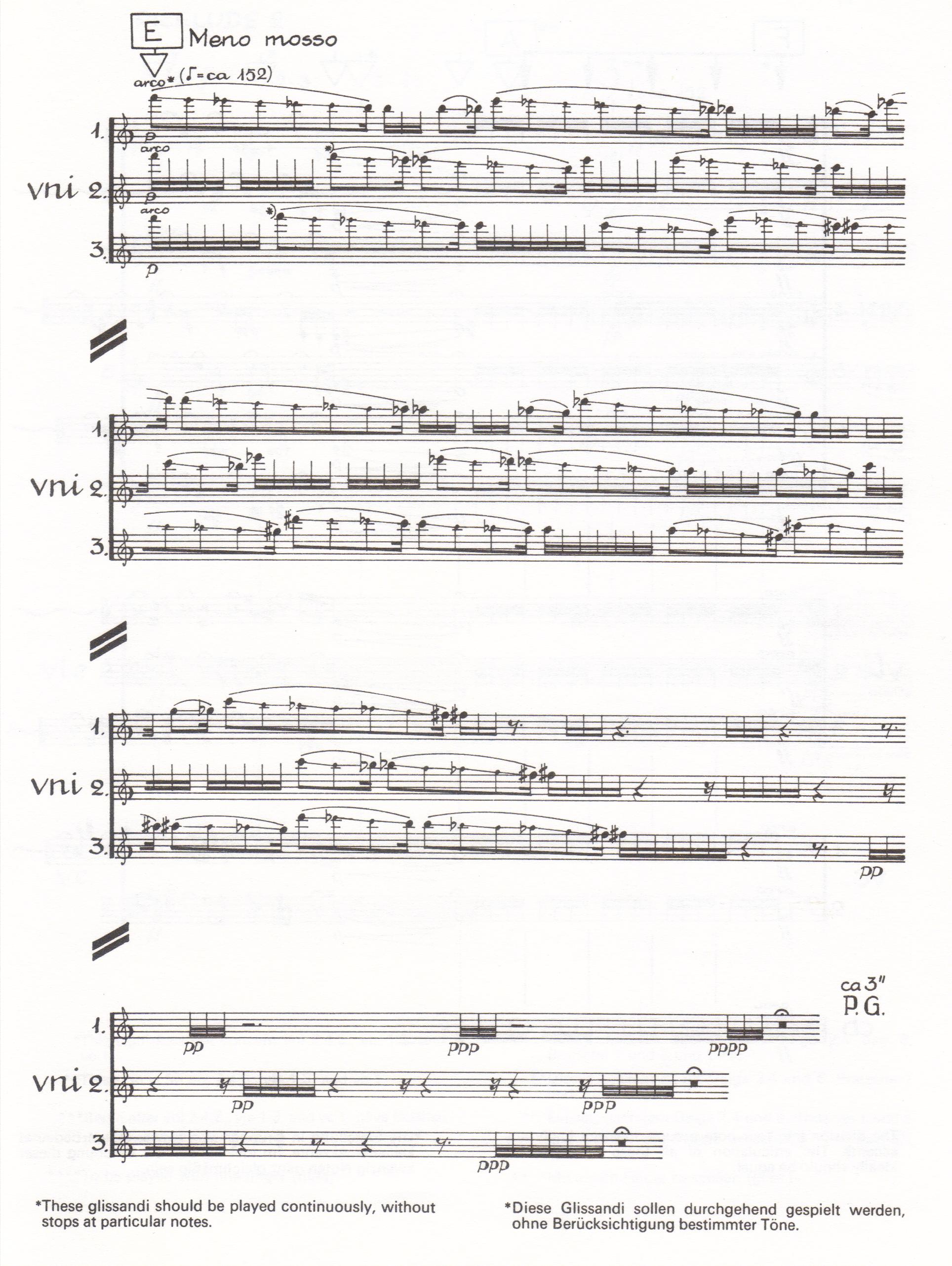 En el siguiente ejemplo saca partido de los armónicos del violín de una manera muy efectiva y que no resulta enrevesada para el intérprete, que debe, como siempre, preocuparse por la expresividad. Acto seguido, y tras una breve escala en fusas, utiliza un motivo de 4 fusas. En vez de indicar con cuartos de tono la exactitud de la afinación, inferior al semitono, simplemente indica que se coloquen los dedos lo más juntos posible, ya que hacer indicaciones más precisas harían el trabajo del violinista insufrible y no mejoraría el resultado sonoro.