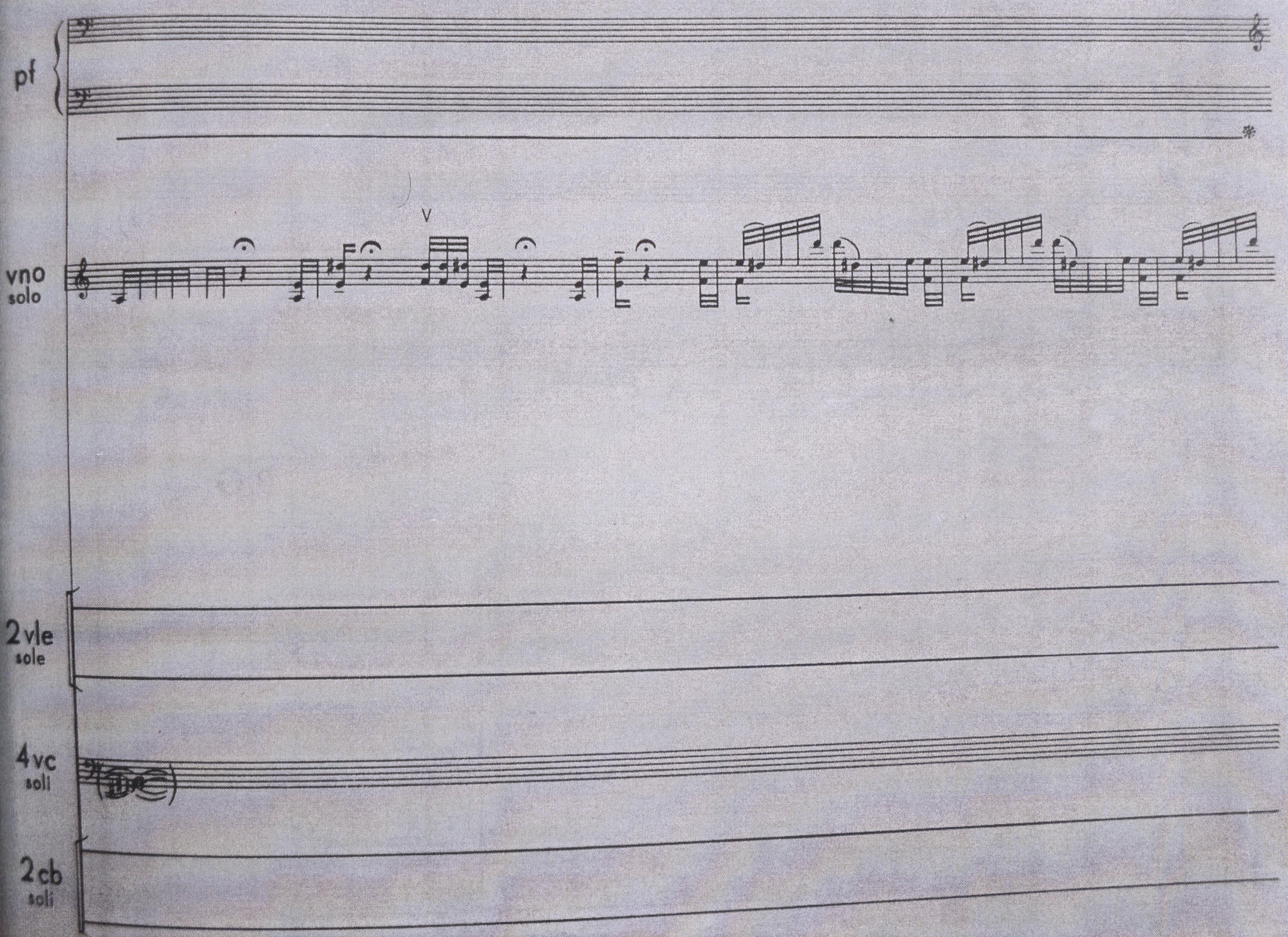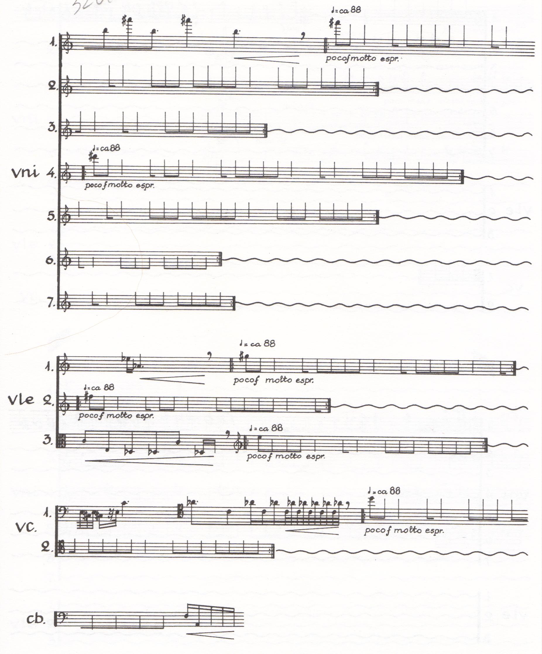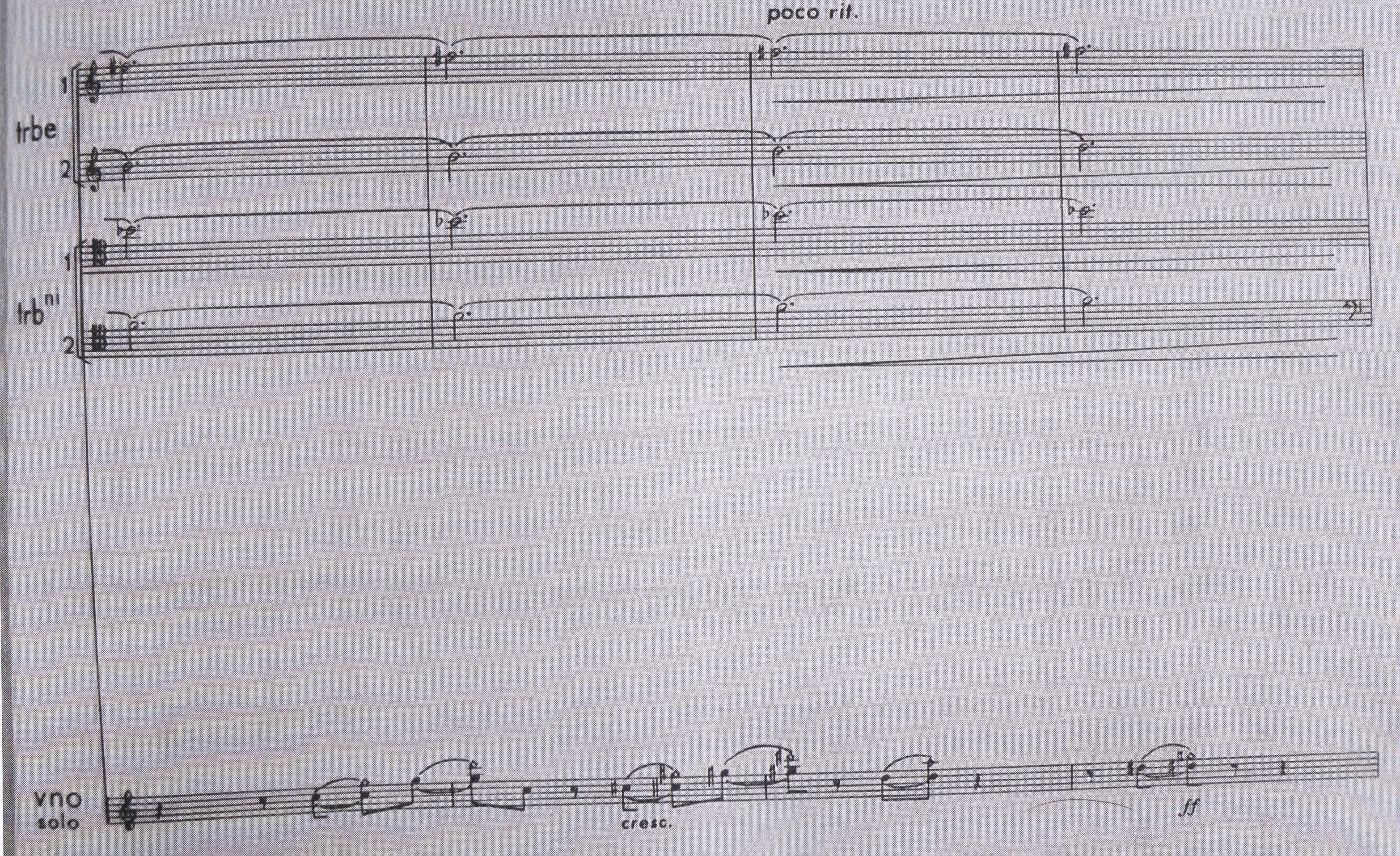 En el siguiente ejemplo saca partido de los armónicos del violín de una manera muy efectiva y que no resulta enrevesada para el intérprete, que debe, como siempre, preocuparse por la expresividad. Acto seguido, y tras una breve escala en fusas, utiliza un motivo de 4 fusas. En vez de indicar con cuartos de tono la exactitud de la afinación, inferior al semitono, simplemente indica que se coloquen los dedos lo más juntos posible, ya que hacer indicaciones más precisas harían el trabajo del violinista insufrible y no mejoraría el resultado sonoro.