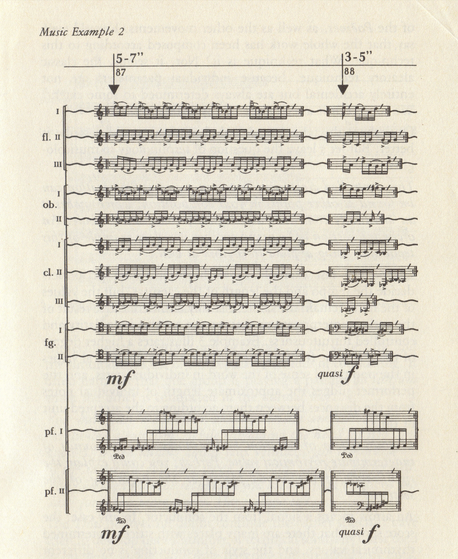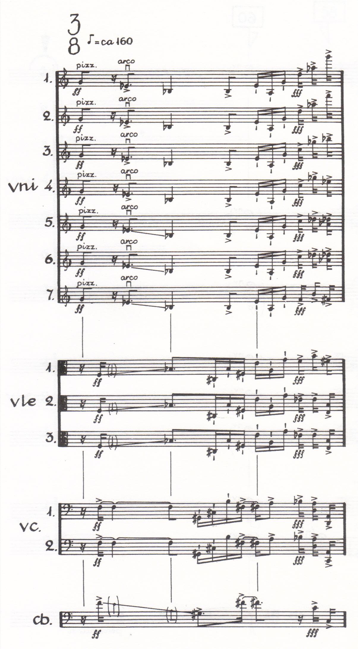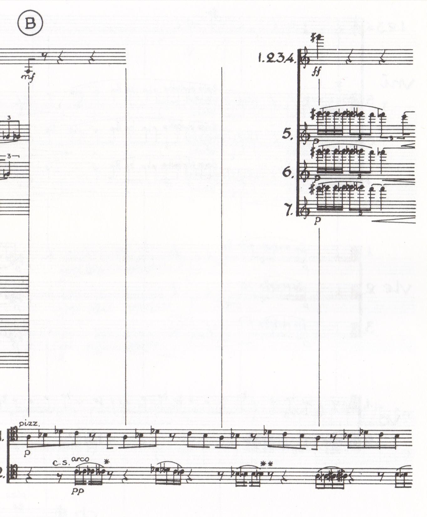 En el siguiente pasaje obtiene una textura puntillista, con notas agudas y armónicos que rodean la nota si, empezando con los violines y siguiendo con entradas paulatinas de los demás instrumentos con notas más graves.