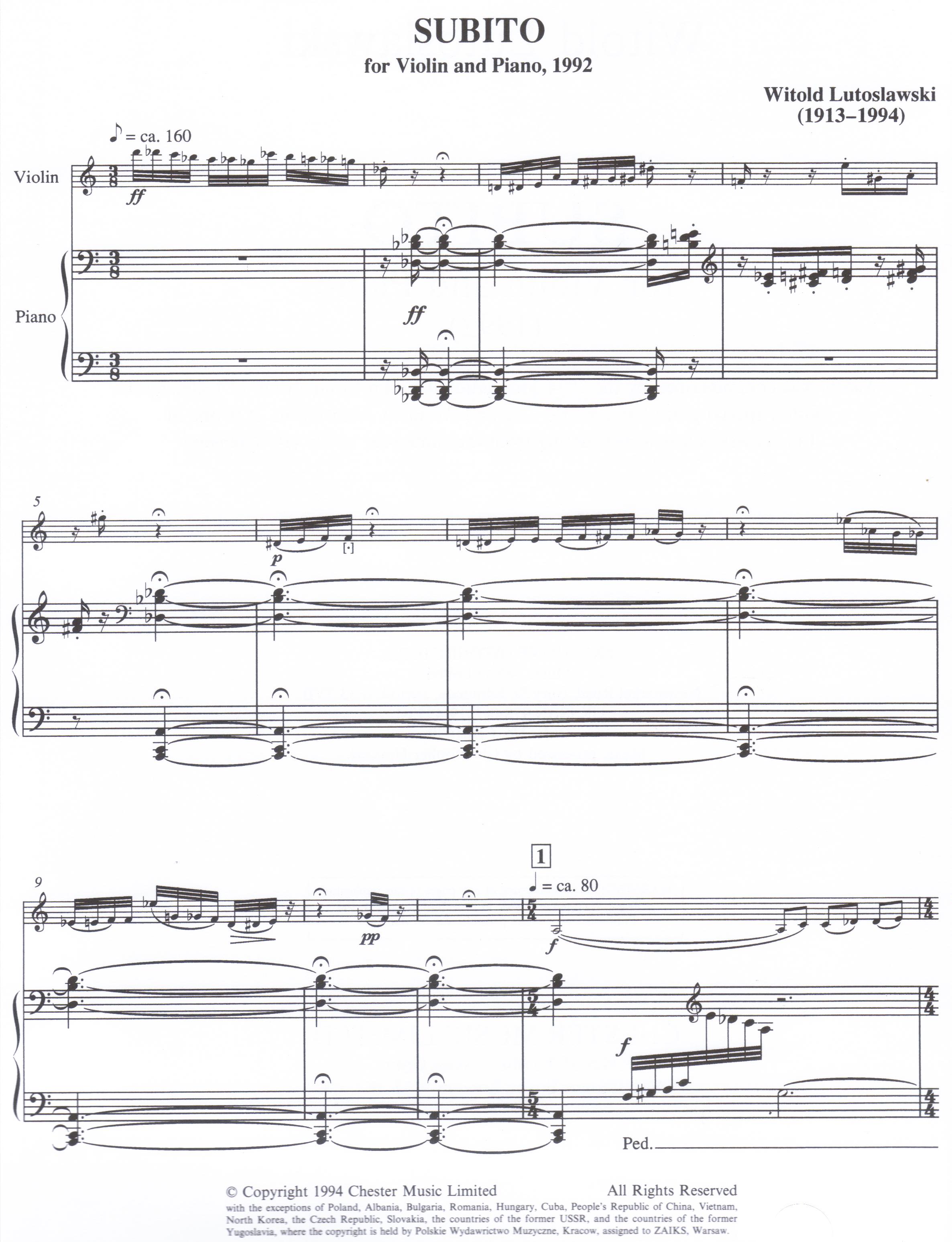 La “Partita para violín y piano” fue estrenada por Pinchas Zuckerman al violín y Marc Neikrug al piano, y no presenta ninguna novedad gráfica, excepto en los movimientos 2 y 4, “Ad Libitum”, donde nos presenta las partes de violín y piano separadamente, encuadradas y para ser interpretadas sin sincronización. Cuando el último acaba su parte, atacan el quinto moviminto, “Presto”.